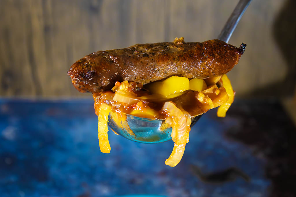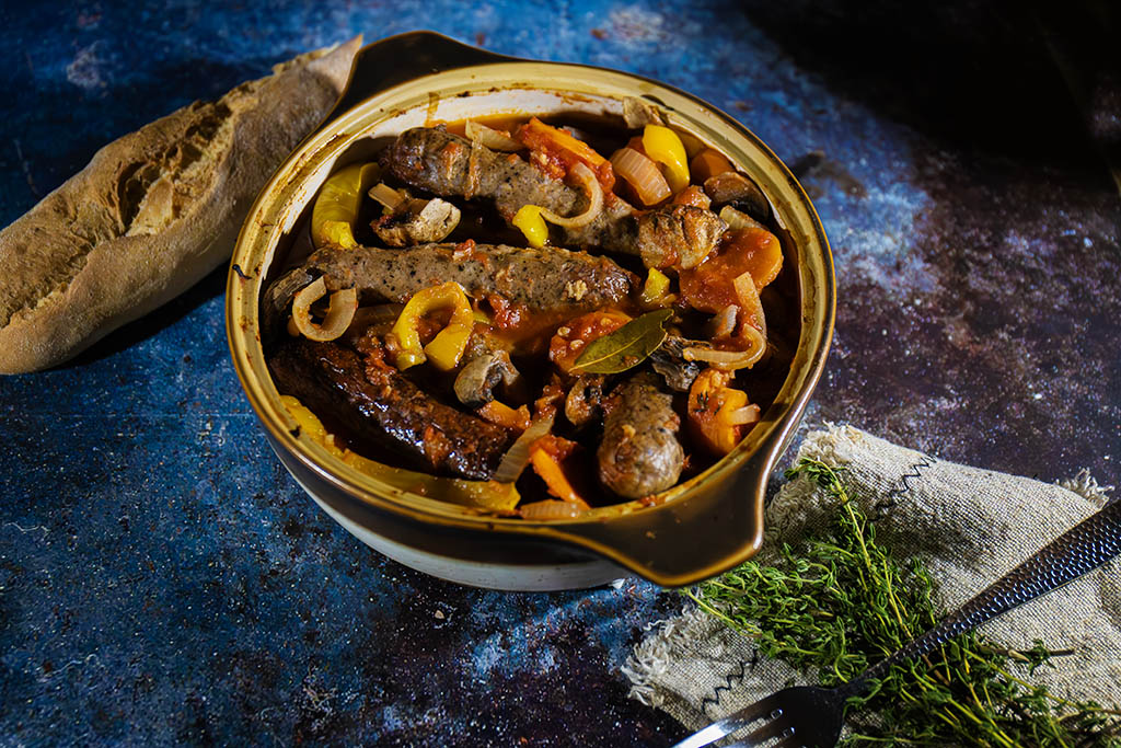 Cover with the lid and place the casserole in the oven for around 1 hour 15 minutes. The sausages will become wonderfully tender and the flavours will deepen as everything simmers gently. If you prefer a thicker sauce, remove the lid for the final 20 minutes of cooking.