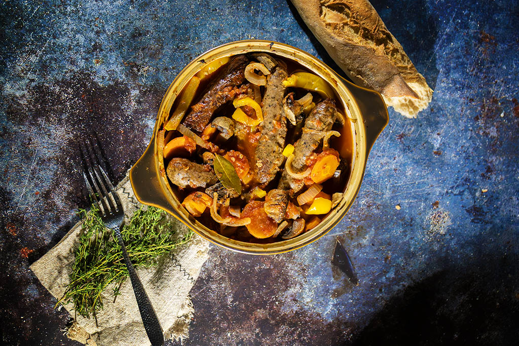 Pour in the chopped tomatoes, stock, Worcestershire sauce, smoked paprika, thyme and bay leaf. If you’d like a richer finish, add a splash of red wine at this stage. Season with a little salt and pepper, then return the sausages to the pot, nestling them into the sauce.